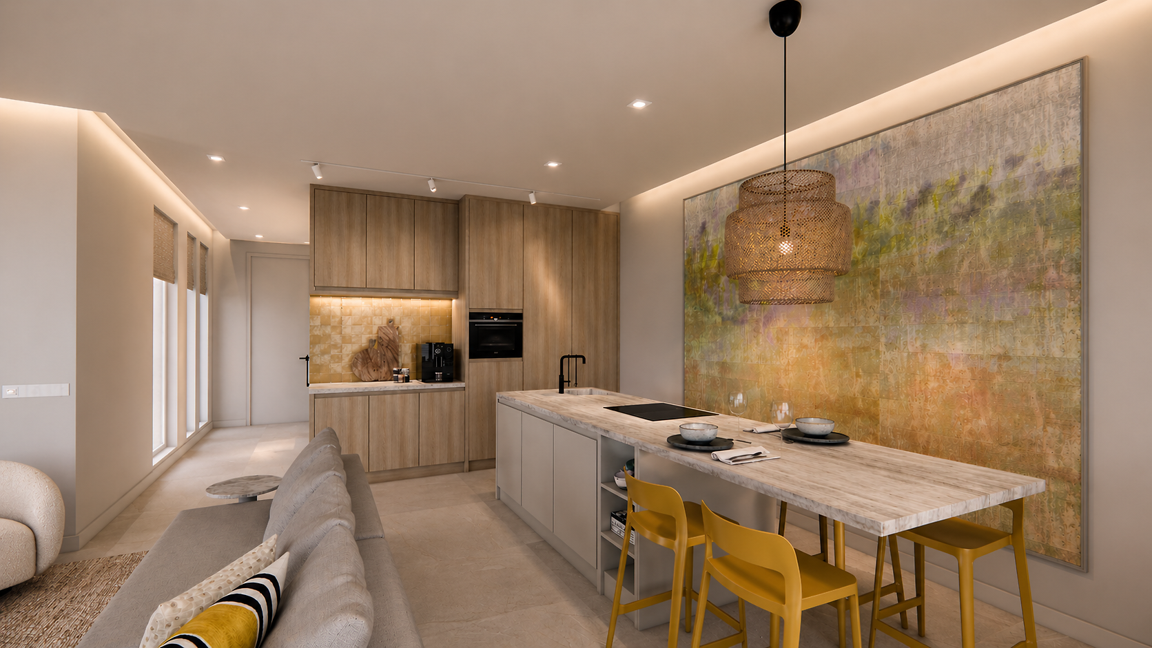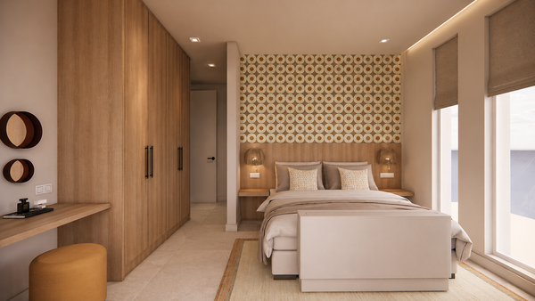 Voor deze vakantiewoning op Cyprus hebben we een warm en ontspannen interieur ontworpen waarin rust, comfort en maatwerk samenkomen. Met natuurlijke materialen en zachte tinten sluit het ontwerp aan op het mediterrane buitenleven. Accenten van geel geven het geheel een speelse en frisse twist.